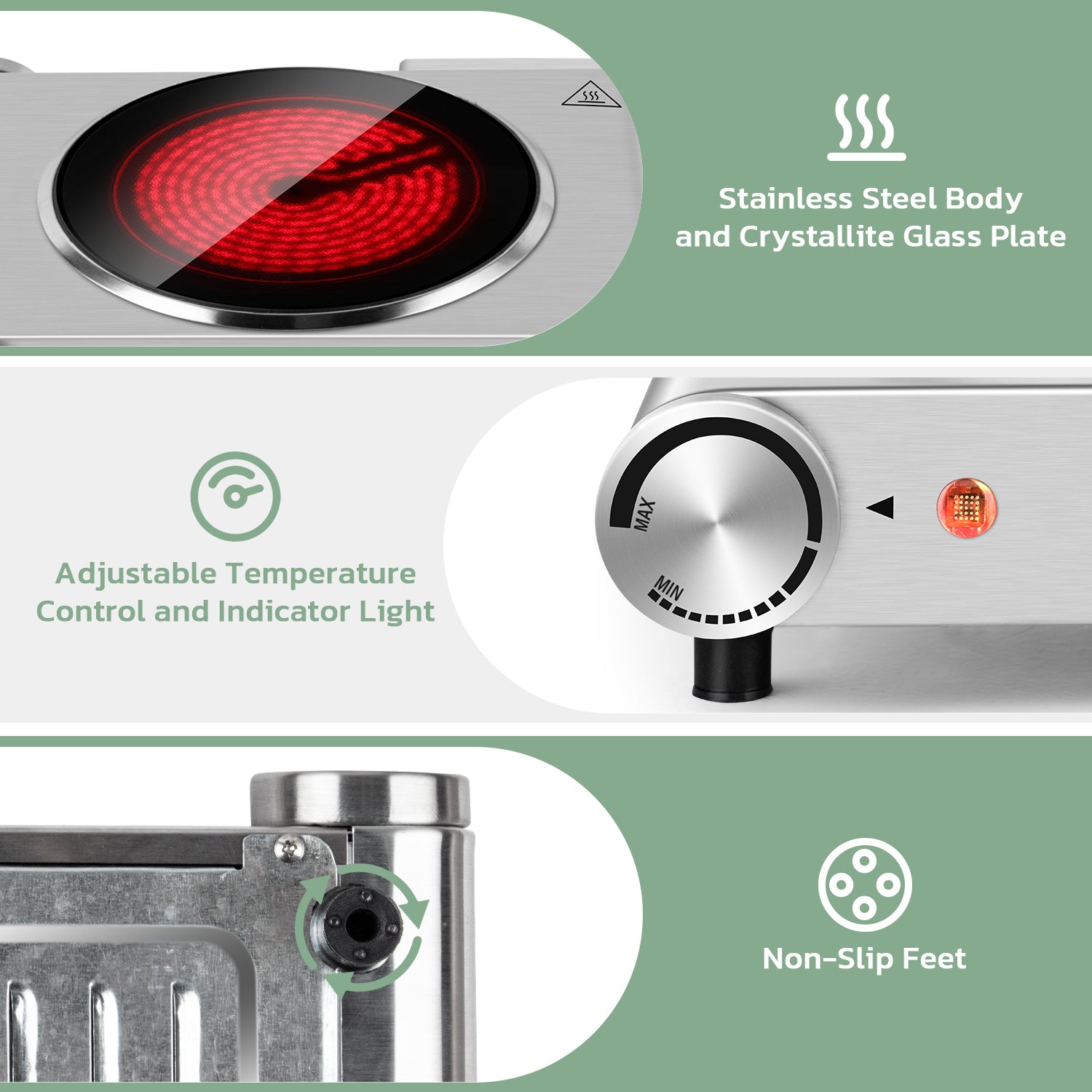 A portable electric burner with thermostatically controlled heating settings, advanced infrared thermal cycling, and thermal protection make it easy to cook a variety, you can use it as an extra burner to keep the food warm.