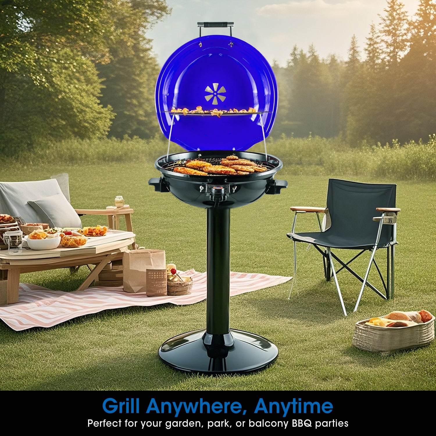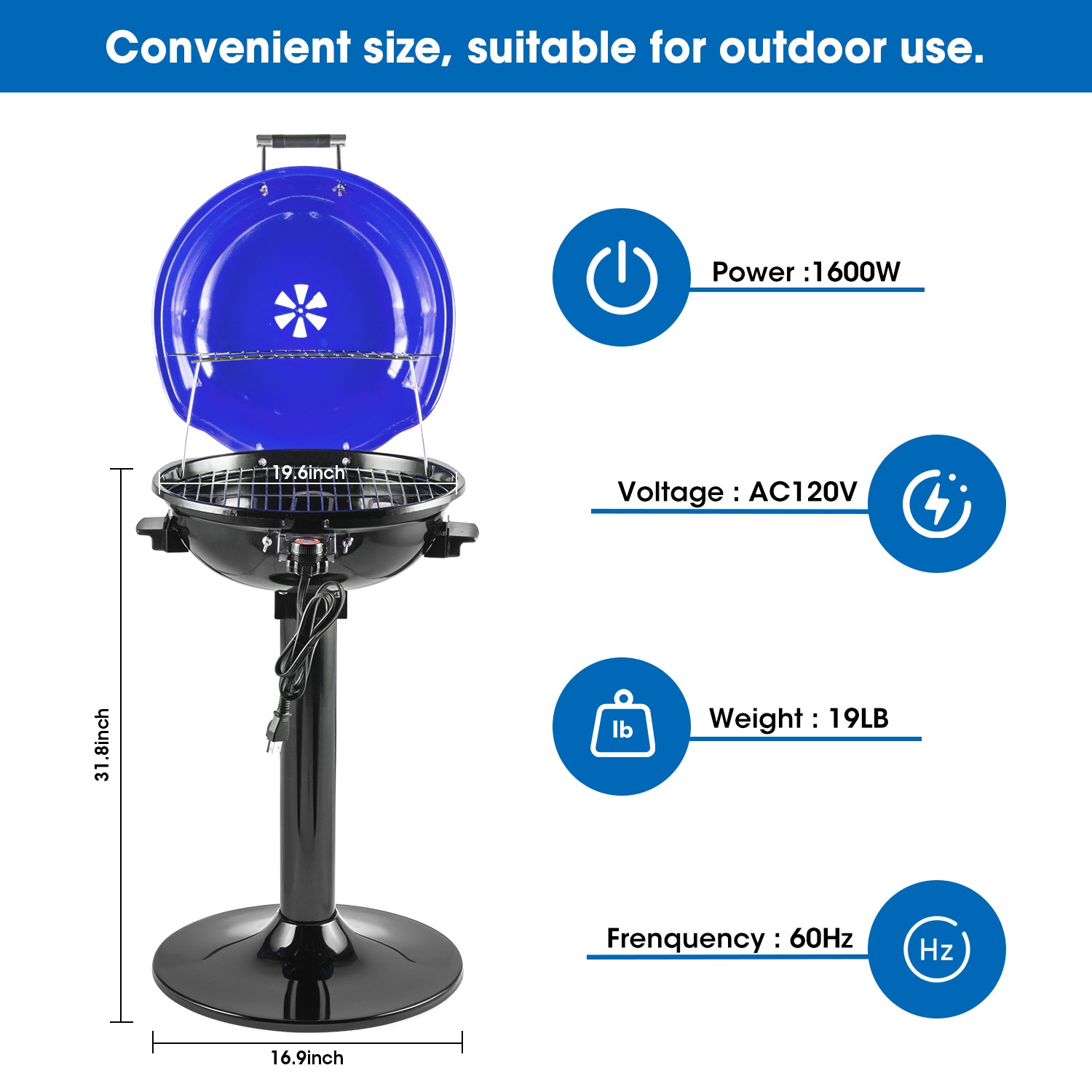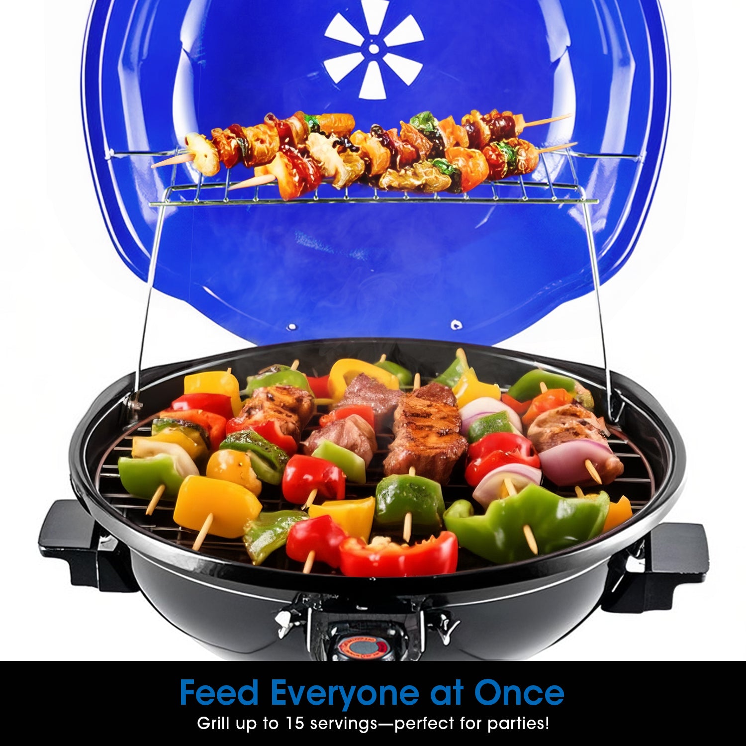 Equipped with a 15" diameter grilling surface, this outdoor electric grill enables you to grill up to 15 servings at a time. If you want to grill with friends or entertain many guests, this standing grill might be a good choice. An electric grill without the hassle of charcoal and propane, just enjoy delicious food anytime, anywhere!